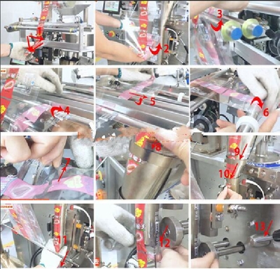 5、注意,如果立式顆粒包裝機安裝了光電眼的話,包裝膜需要經(jīng)過光電眼固定位置,如圖標示7的位置,把包裝膜卡在不銹鋼板上;